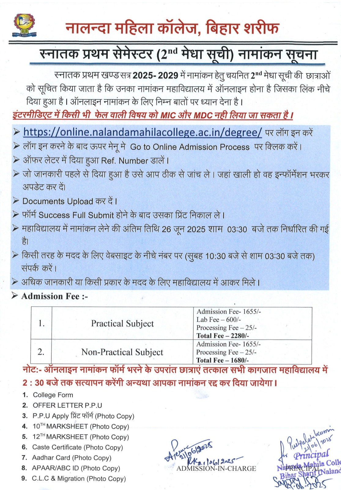 NOTICE REGARDING UG 1ST SEMESTER ADMISSION 2ND LIST (2025-29)