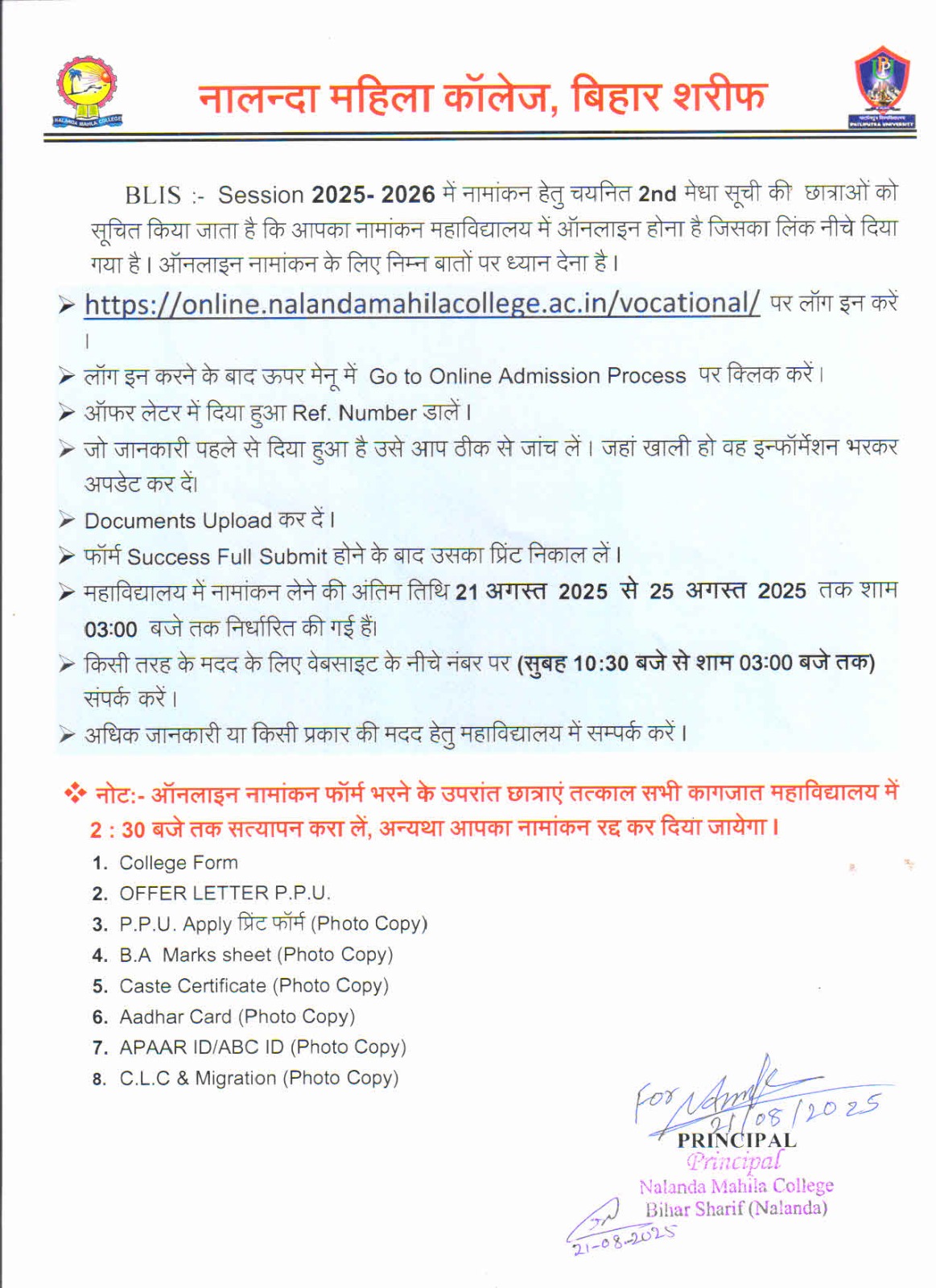 NOTICE REGARDING BLIS ADMISSION 1ST YEAR 2ND LIST (2025-26)
